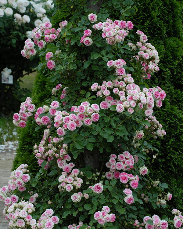 白色の外弁に中心が桃色の花保ちの良い可憐な花をたくさん咲かせ、アーチ仕立てなどにすると華やかで一層映えます。
